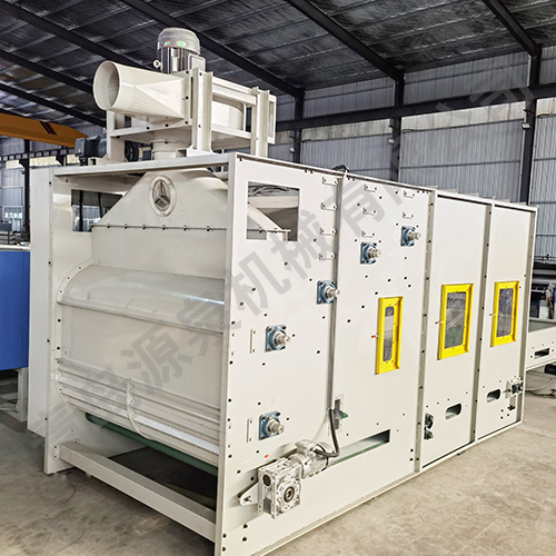 將開包后稱量分配好的纖維,喂入平簾輸送至主體混倉內(nèi),再由5道開松輥高速開松混合后,經(jīng)輸棉風(fēng)機(jī)以適量的風(fēng)量輸送纖維原料供后道工作使用。本機(jī)由雙電機(jī)控制五道開松輥,轉(zhuǎn)速、運(yùn)行更加穩(wěn)定。